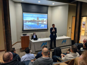 Todd Williams, chief growth officer at Divirod, described how his business uses sensors to measure water levels over time, helping communities understand flood risks, create early warning systems for hurricanes and high tides, prepare for disasters, and manage stormwater and reservoirs. Divirod is part of The Water Council’s BREW 2.0 Post-Accelerator for late-stage start-ups.